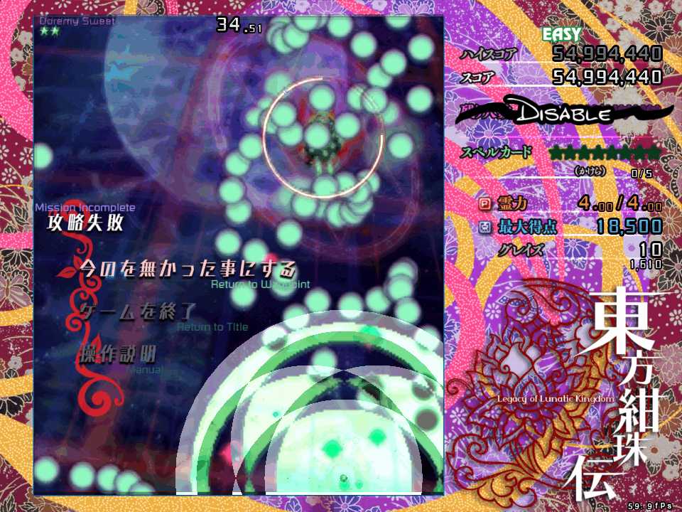 その時初めて今作独自の完全無欠モードのシステムを目にすることになったのですが、ボス戦では通常弾幕あるいはスペルカード発動の瞬間からやり直すことが出来、その際自機の位置やアイテムの配置が直前のものを完全に再現します