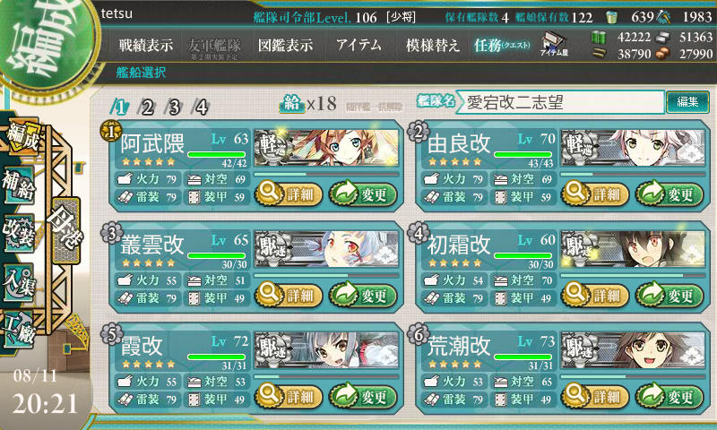 @106tetsu うちのE-2メンバーです (木曽大井飛龍蒼龍は二人目なので参考にしないでね)雷巡はE-5に木曽 E-3に北上大井ですかね