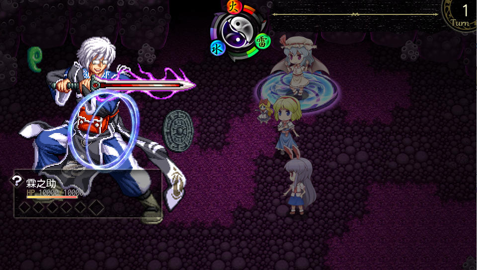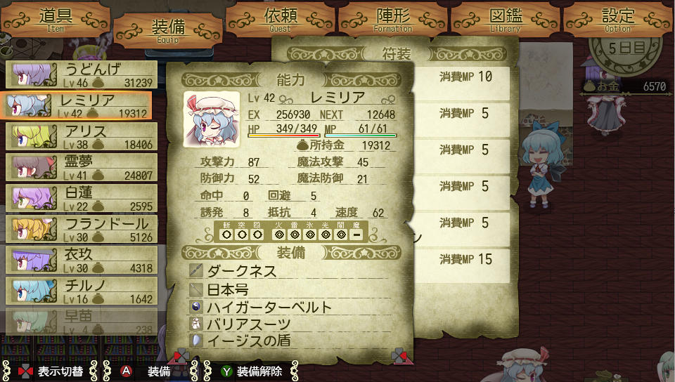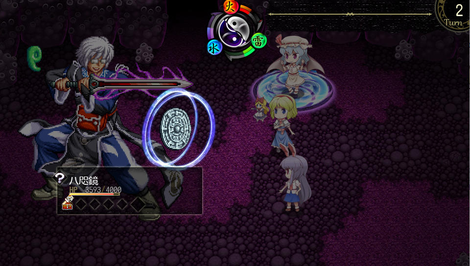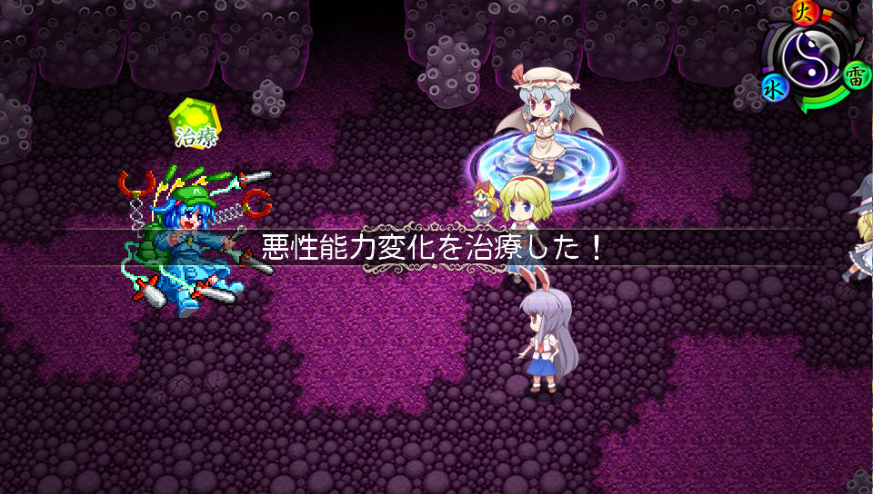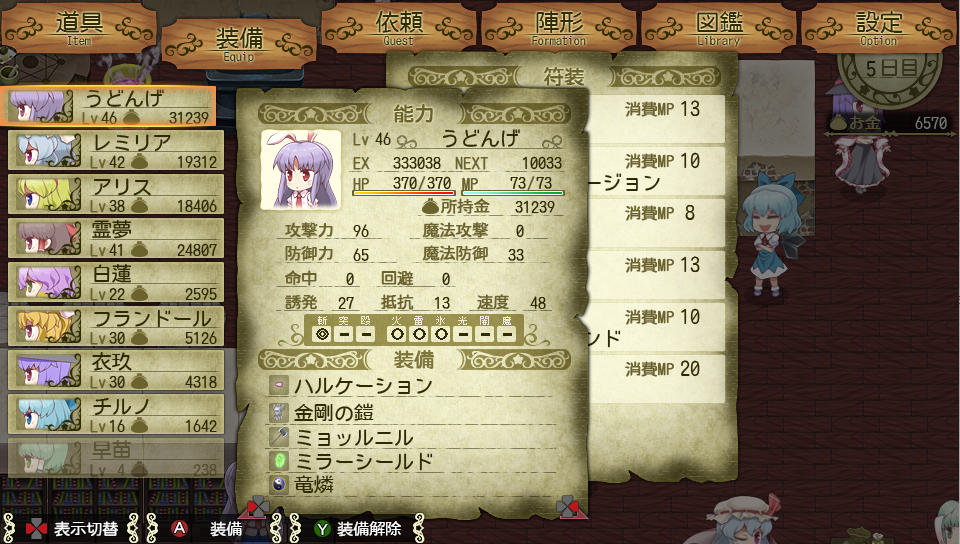 戦闘中は序盤はアイテムの雷珠玉でランドを傾けて、レミリアはブラッドランスのみ使用、アリスは適当に防御技を使い、うどんげも適当な攻撃技を使用