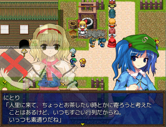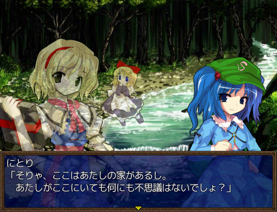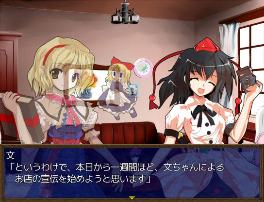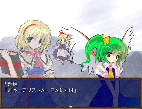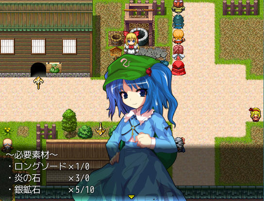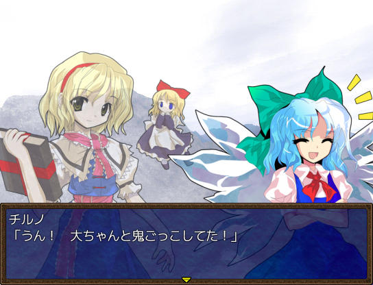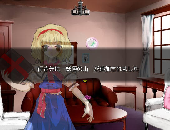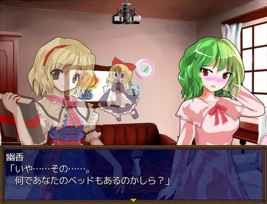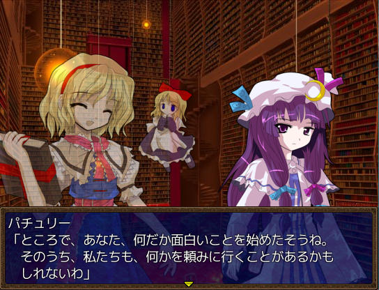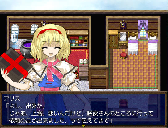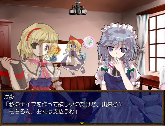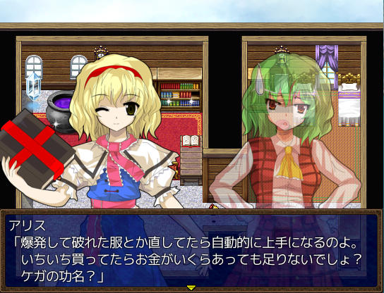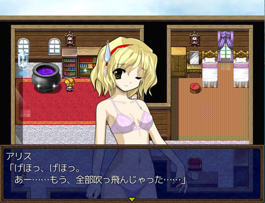 アトリエのベッドで休むとイベントが ファッ!?パジャマゆうかりーーん!!(゚∀゚) ある日文が訪ねてきた 1週間何か起こるのか? 行き先に妖怪の山が追加されました 霧の湖にて大ちゃんと遭遇 お、チルノもいるじゃん 妖怪の山にてにとりと遭遇 調合に失敗すると初回時イベントが発生 フォオオーーーー!!?!?(歓喜) 爆音に驚きゆうかりんが駆けつけるが、下着姿にもっと驚く! え!?アリスが裁縫得意な設定ってそういう理由だったの!?衝撃の事実… にとりが人里に出現 にとりは素材を合成して装備品を作ってくれる ある日咲夜さんが銀のナイフの作成を依頼してくる 銀のナイフ完成 お、紅魔館に招待されましたよ♪ 紅魔館内は選択肢で移動する方式 ADVみたいだ 紅魔館の住人たちと会話 今はこれといったイベントは発生しないようだ