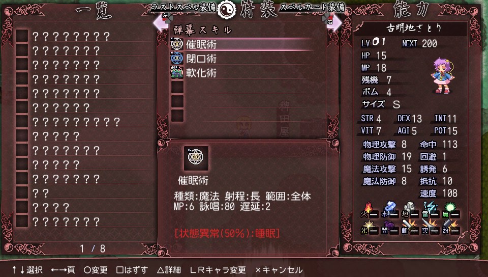 ボスのさとりは状態異常やステータス低下付きの攻撃を使用しますが、攻撃力は低く、早苗の技で抵抗を上昇させれば十分対策出来ます