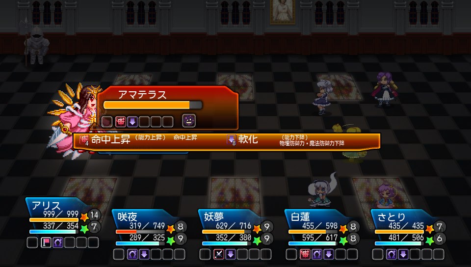 また、アマテラスは物理攻撃の威力も高く、特にウェポンブレス後の攻撃力は後衛が即死するレベルなので、アリスが蓬莱人形で囮となり、白蓮はパワーダウンで弱体化させよう