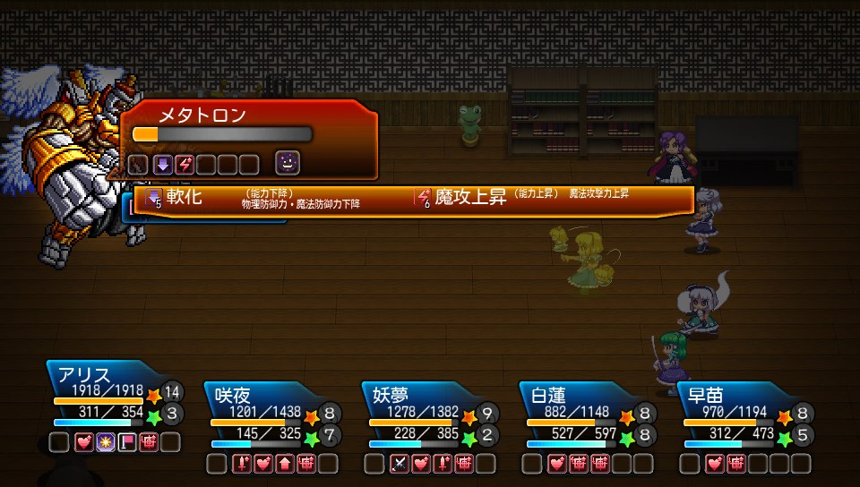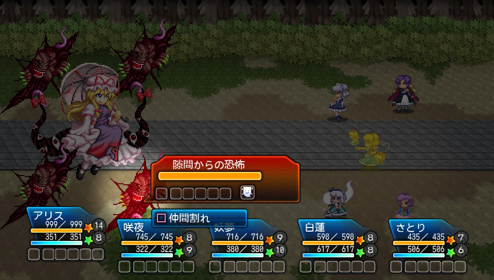紫が使ってきた強力なスキルがメテオなのですが、アリスのリトルレギオンとさとりのリフレクトウォールを交互に使えばほぼ完封できますし、紫がボム充填してきた時は咲夜のプラベで潰しました