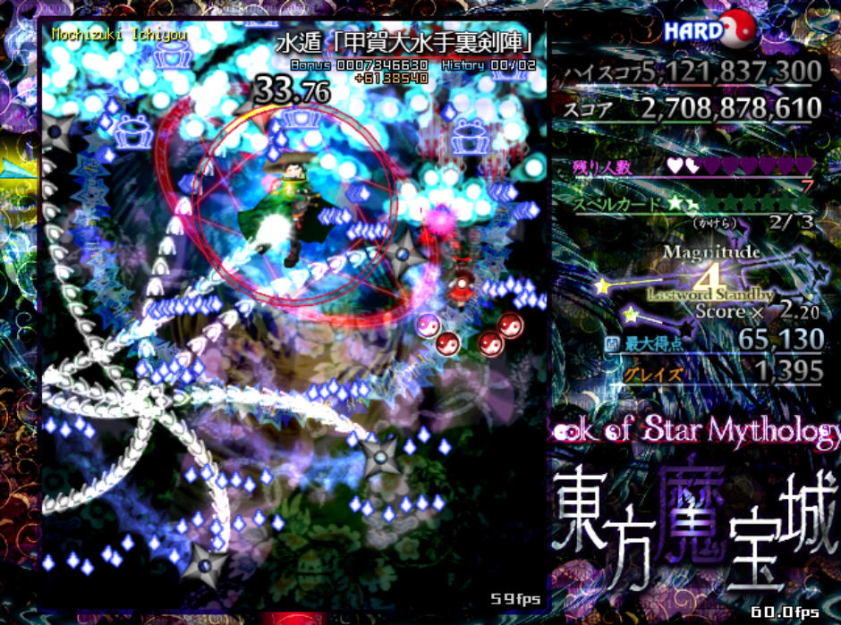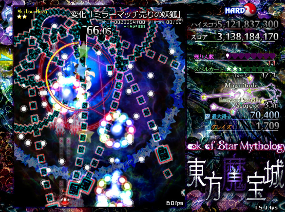 4面ボスの一曜ちゃんにコテンパンにやられて残機0になった時はもうダメだと思ったんですが、エクステンド回数の多さに救われて残機を持ち直し、ミス回数13回、残機1を残してラストまでクリアすることができました