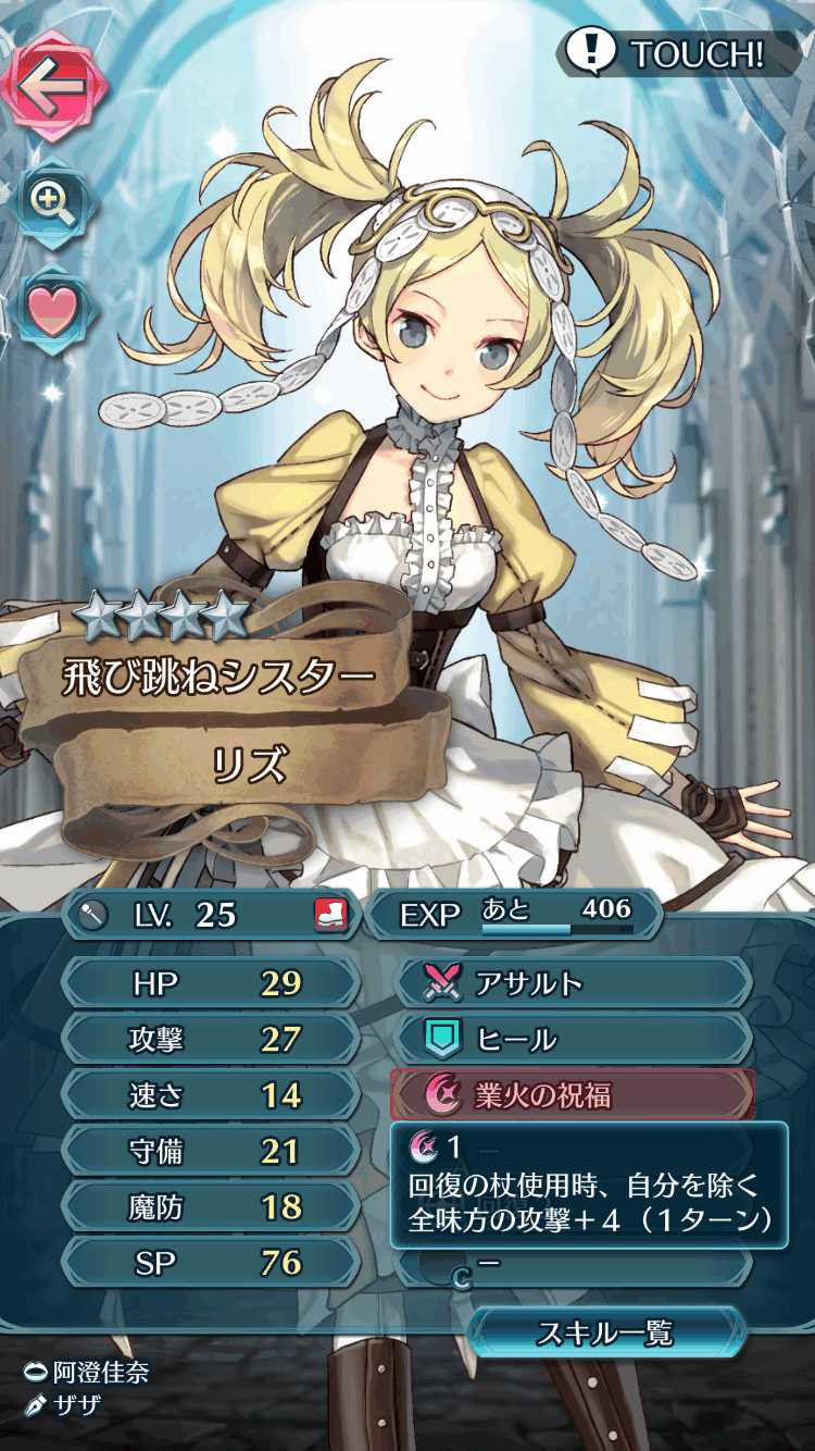 味方がLVUPした際にHPが成長すると杖での回復が可能になるので、スキル発動のチャンスになります