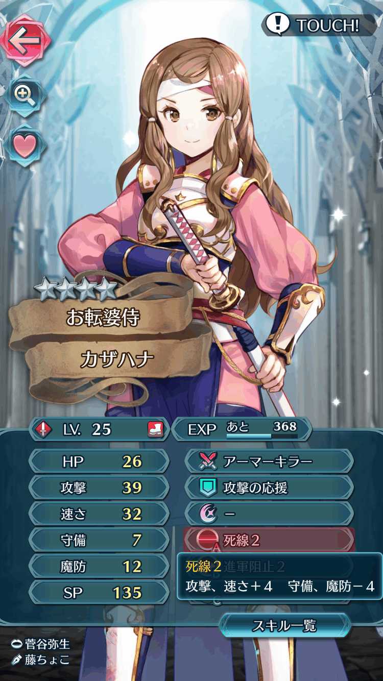 こんなダイナマイトみたいな極端な性能になっているのはスキルの効果によるもので、死線を修得すると攻撃・速さが+4、防御・魔防が-4され、それがステータスに反映されているわけです