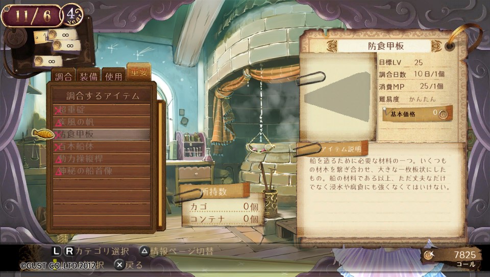 必要なアイテムは全部で6つで、そのどれもが調合のために大量の素材と調合アイテムが必要なため、非常に時間がかかります