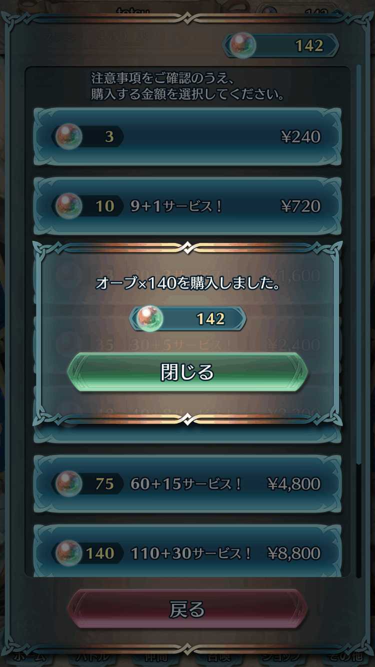 そして開催中のピックアップガチャの期間が15日の16時で終了し、その際に万が一上昇している☆5排出率がリセットされたら嫌過ぎるので、課金でオーブを購入して☆5が出るまでガチャを回すことに