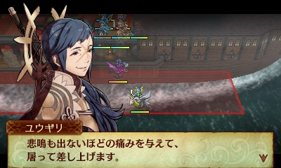 船の縁は待機不能の地形になっており、これに沿って船上に自軍ユニットを敷き詰めると敵ユニットが侵入できなくなるあたり、蒼炎の12章と同じ戦術が使えました