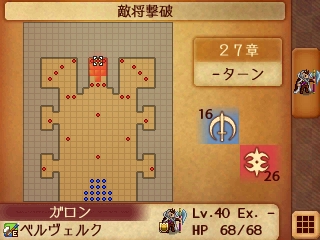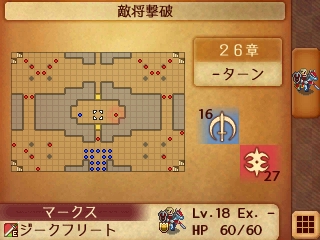26章は中央の小部屋で主人公とマークスの一騎打ちが展開され、その周囲でそれ以外の敵味方が戦うのですが、クリア条件はマークスの撃破なので、1ターン目から主人公でマークスを獲りにいくとあっという間にクリアできてしまうため周りのザコ敵から得られる経験値が無駄になってしまいます