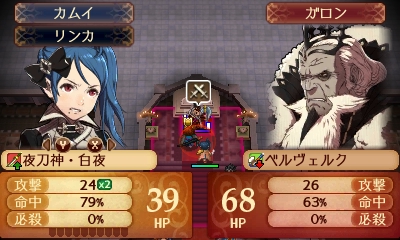 またガロンのスキルで、ガロンと戦闘したユニットは全能力が-4されてしまうので、プレイヤーフェイズでは問題なく攻撃できてもエネミーフェイズではステータス低下でこちらの被ダメージやガロンの必殺値が上がったり、最悪追撃される恐れもあるので、ステータスに不安がある場合はガロンの方から攻撃させ、ステータス減少後の戦闘結果予測を参照しよう