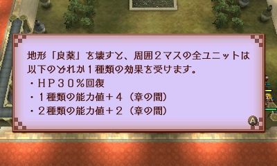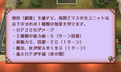 効果は章の間続くものもあるため、良薬は周りに自軍を集めてから積極的に破壊したいが、劇薬は極力破壊しないようにしたい
