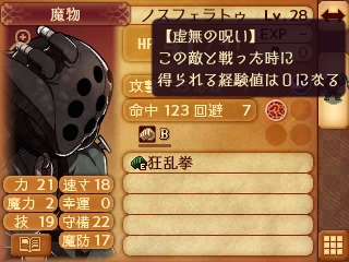 このマップは上下から増援が無限に沸いてくるので経験値稼ぎ放題じゃないかヒャッハー!!ってなるかと思いきや、増援で出現するノスフェラトゥは虚無の呪いというスキルを持っており、これがついていると戦闘をしても経験値が得られなくなるという、敵にとってもほぼメリットがないスキル