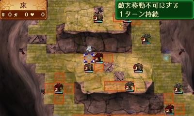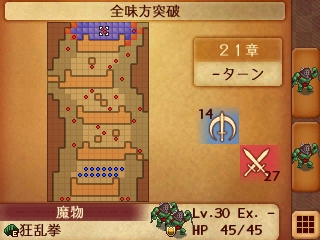 ただし、要所に配置されているゴーレムは元々移動が0なので効果はなく、相変わらずの長射程で近接、間接のどちらにも攻撃力の高い反撃をしてくるため、プレイヤーフェイズのうちに一気に倒せるだけの攻撃役をそろえるのと、ダメージを受けたらすぐに回復できる体勢を整えること