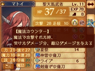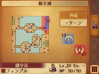 ここの外伝マップに出現する敵は通常のザコ敵は上級兵種LV10なんですが、ボスを含む一部の敵はLV20でカンストしており、ボスに至っては魔力が35でカンストしているため強敵
