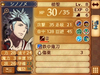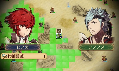 救いだったのは杖の七難即滅が、かなり特殊な効果を持つ割に武器レベルがEで誰でも使えるという点で、聖天馬武者なら自軍の初期配置から最大移動すればシノノメに杖の範囲が届きます
