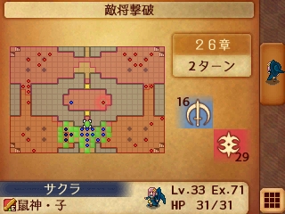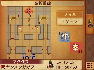 25章は敵将のいる奥の階段付近にドロー持ちのストラテジストがいて、これを食らうと敵の本隊近くに引きずりこまれて絶体絶命になるところだったんですが、運良く外れたので事無きを得ました