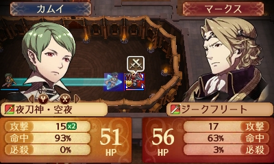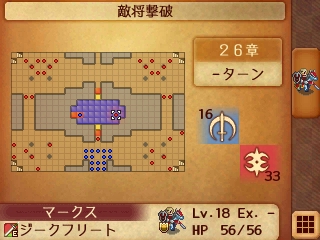 こちらから仕掛ければ1ターンで決着がつきそうではあるが、エネミーフェイズにマークスは間接攻撃してくるためこちらから反撃できず、結局攻撃回数はお互い2回ずつになるんですが、ちょっと卑怯だよなあw