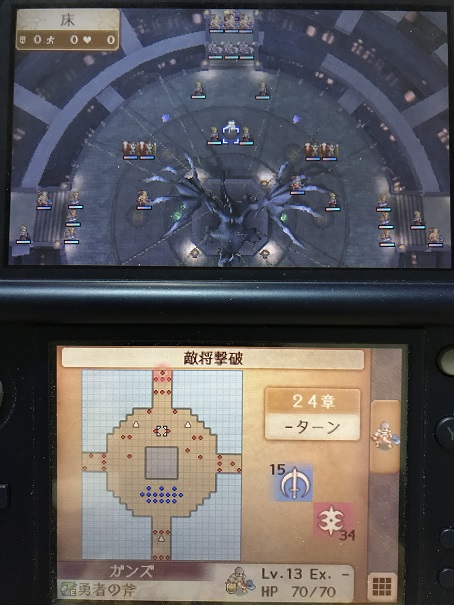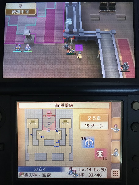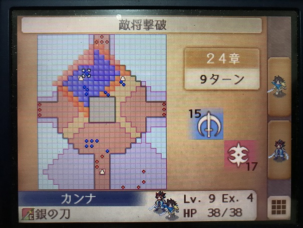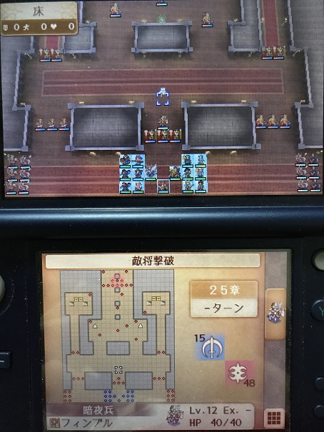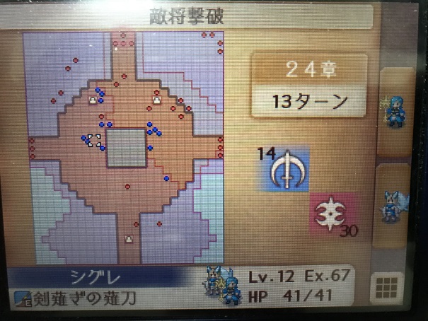 そのため左のボウナイト、右の駄アークナイトの攻撃範囲ギリギリに攻撃力の高いユニットを攻陣で配置し、エネミーフェイズになるべく反撃で敵を撃破して敵の数を減らし、プレイヤーフェイズでは残った敵を倒した後再行動や救出で増援の攻撃範囲外に避難するか、増援の攻撃に耐えられるユニットで近づいてきた敵を倒しに行くこと