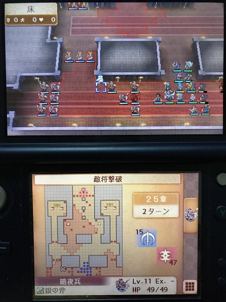 暗夜ルートなら経験値が稼げる量が限られるため一人残らず倒すのですが、白夜ルートでは遭遇戦を周回すればここで経験値を稼ぐ必要もないので、一番安全な方法をとりたい、自軍ユニットを動かすのが面倒だ!という人は本来のシナリオ通りマークスとの一騎打ちを挑んで勝利しましょう