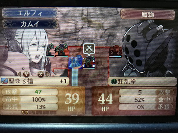 そのためには聖なる槍を+1にし、エルフィに食事や薬で力をドーピングした上でカムイを防陣