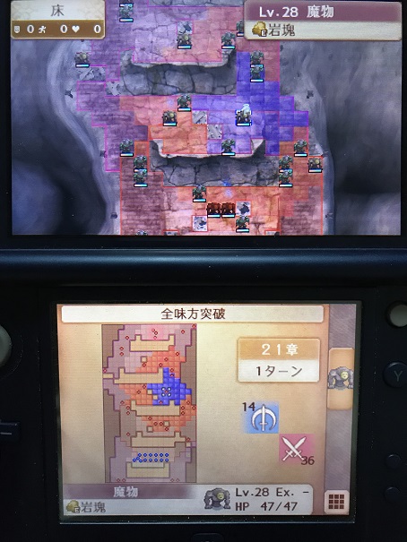 暗夜ルナの凶悪さが感じられる高難度のマップですが、敵が増援以外は全て待ち伏せ型で攻撃範囲に入らなければ向こうから動かないのでパターン化しやすく、何度か繰り返していると安定してきて最後にはクリアできました