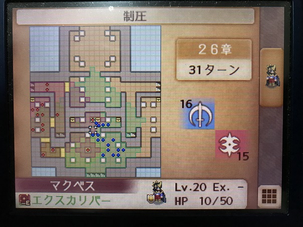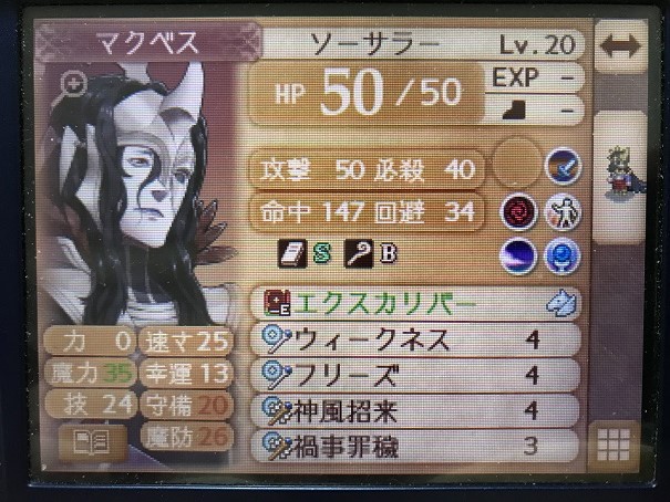 マクベスのエクスカリバーは必殺値が非常に高く、ここまで来て必殺で死んだら泣くしかないので、青銅武器の必殺回避で必殺を0%にするか、それができない時は魔防の高いユニットに補助をかけ、必殺でダメージが3倍になっても耐えられるユニットで攻撃すること