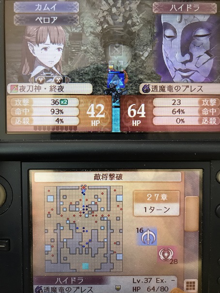 何度かリセットして試行した結果、カミラで事前にボスのHPを削っておくことで主人公の追撃で倒しきることに成功!
