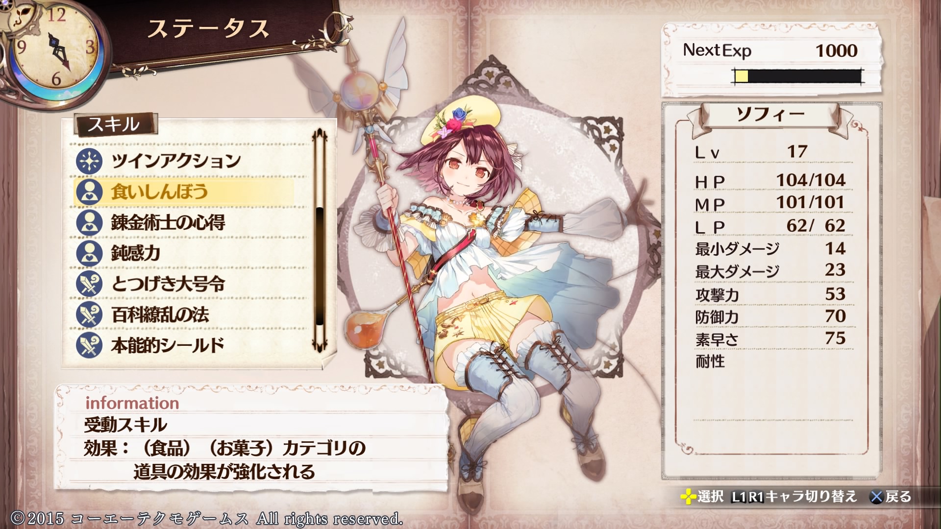 また、衣装チェンジするとキャラモデル以外にもメニュー画面のイラストや調合成功時のスチル、そしてなんとデータをロードする前のタイトル画面のソフィーの衣装も変化します!
