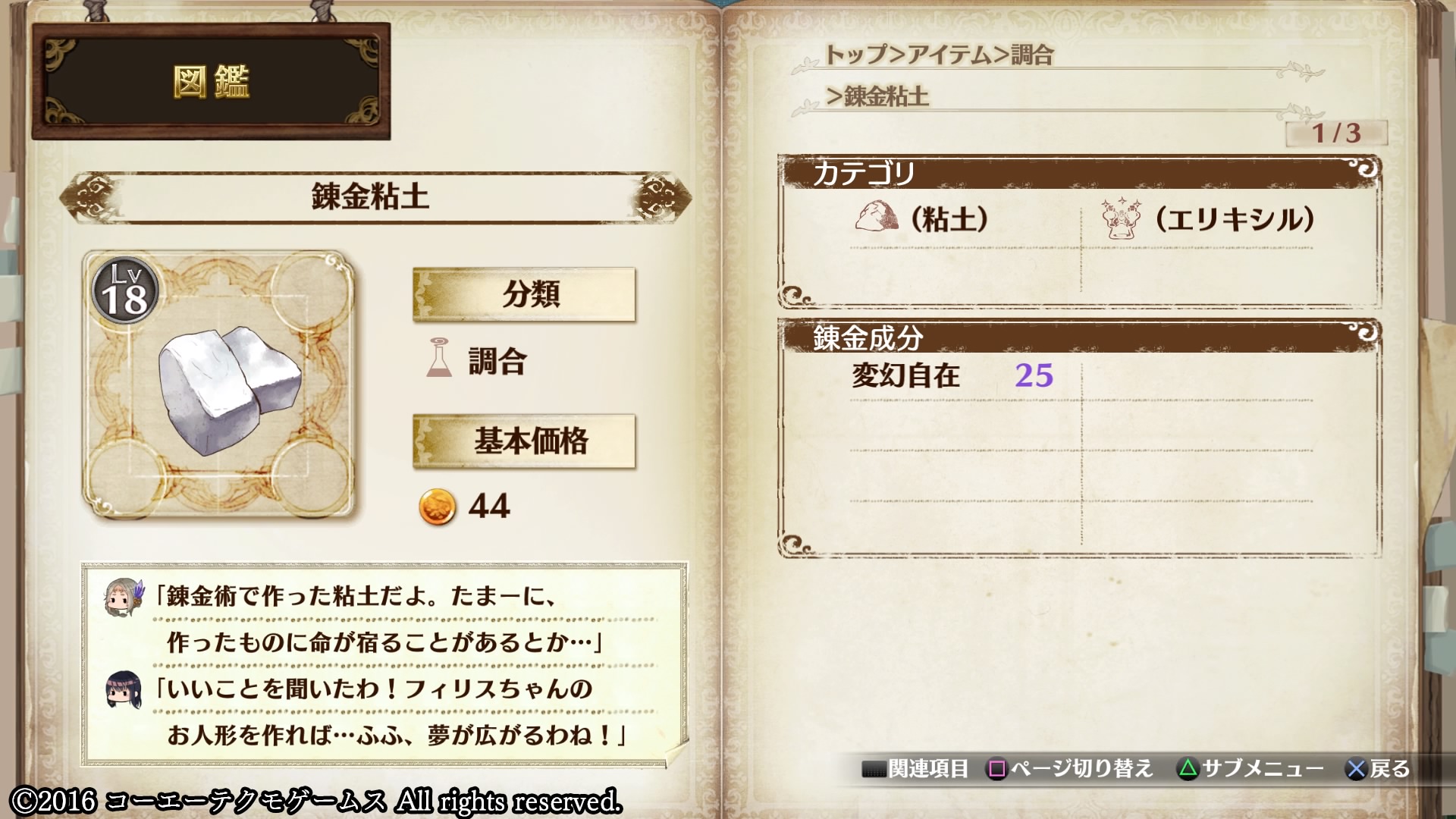 フロッケ村の錬金術士の課題では、素材となるエリキシルが調達できず達成できない状態でしたが、粘土の素材を採取し続けることで錬金粘土のレシピを発想