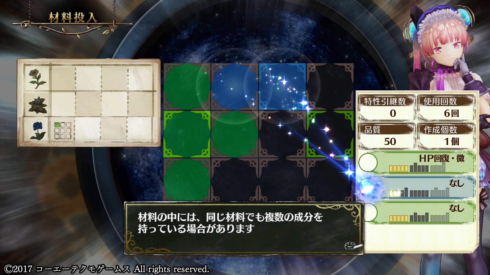 錬金成分が多いほど多くのマスを埋められるため高品質で効果の高いアイテムが調合できるようになるが、当然パネルに納めきるのが難しくなるので注意