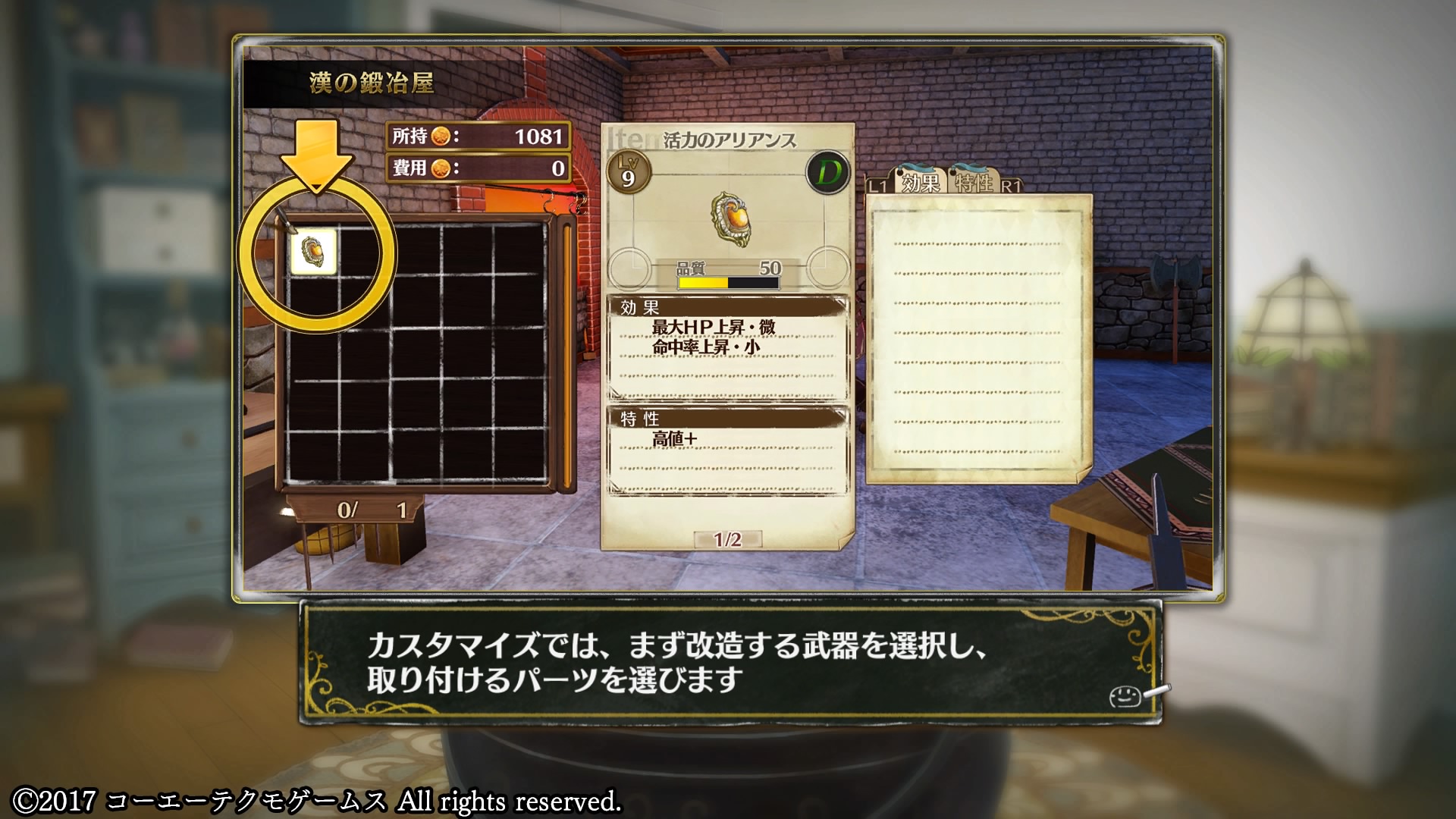 新たに鍛冶屋で利用できるようになったカスタマイズで、武器にメインパーツとサブパーツを組み込むことでパーツの持つ特性を武器に付与できるというもの