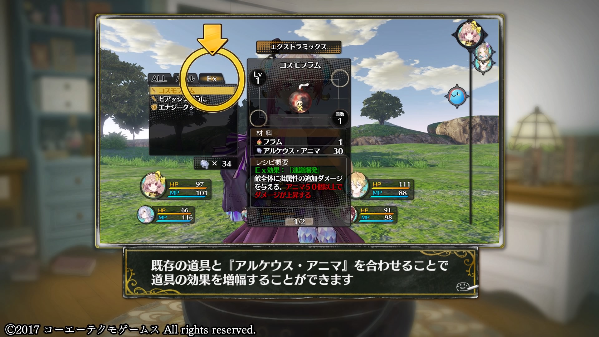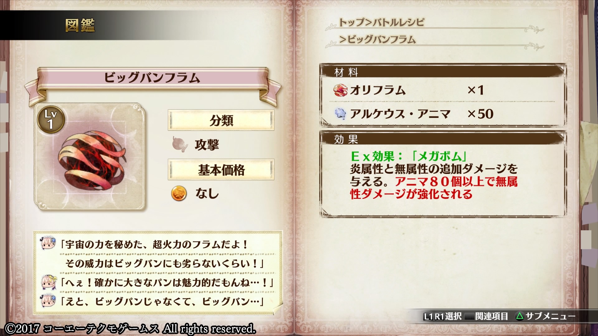 効果を最大まで増幅させるには通常のバトルミックスの10倍~数十倍ものアルケウス・アニマが必要となり、所持数制限が99個のため一度の探索で1,2回しか使えず、まさに錬金術の奥義というにふさわしい究極の技