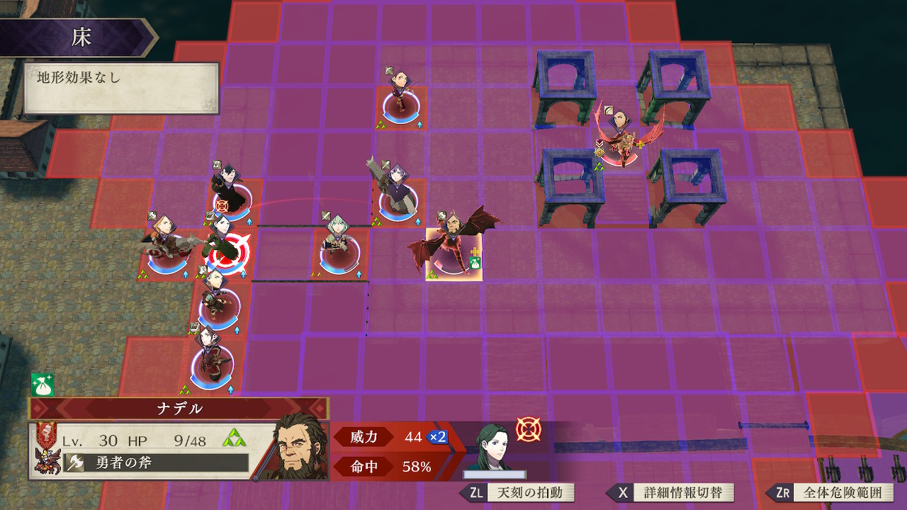ナデルは勇者の斧を持ちその攻撃は56で、最大の防御を誇るエーデルガルトでさえ対策なしでは耐えられずに即死する可能性があるため、囮役を配置しておびき寄せる方法は使えない