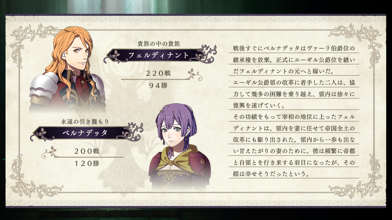 ちなみにこの学級で個人的に一番好きなキャラはベルナデッタでしたが、彼女はフェルディナントと結婚して幸せな引きこもり生活を送っているようでめでたしめでたしです(*^-^*)