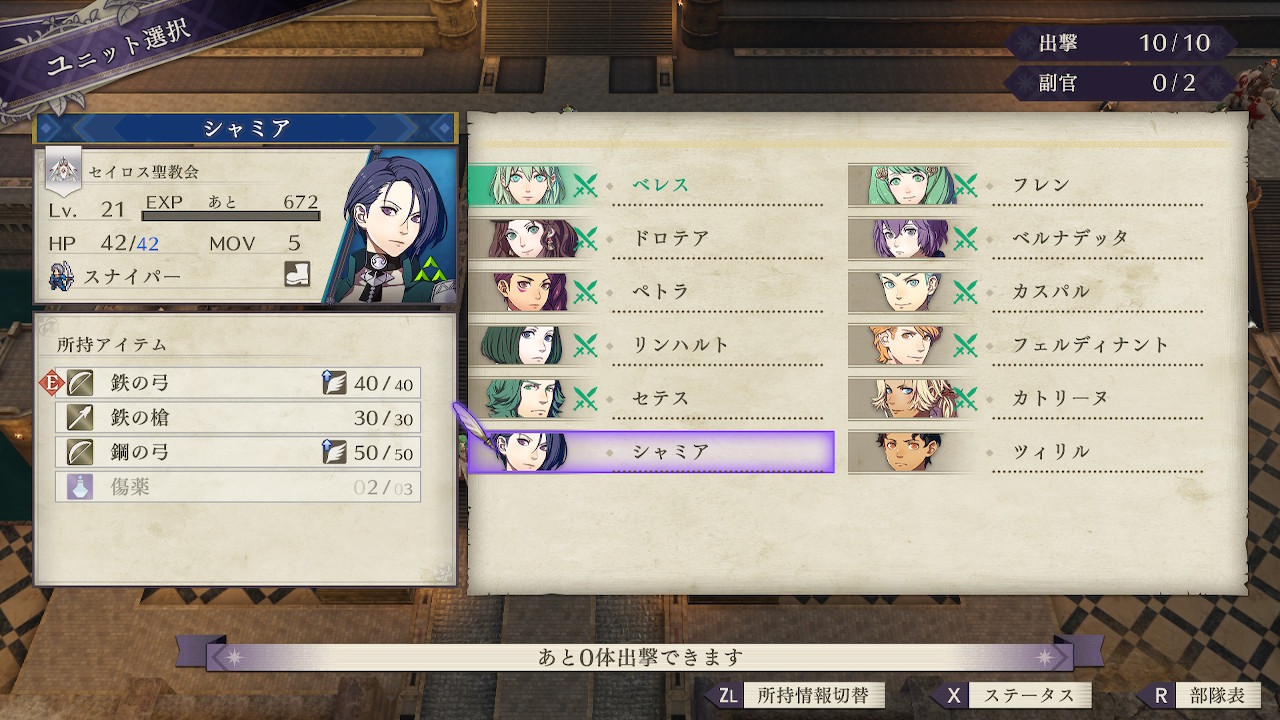 1周目のルートでは自軍ユニットの数が増えなかったため何も考えず全員出撃してたが、今回は自軍ユニット12人のうち、出撃枠は10人で、副官を2人任命することになる