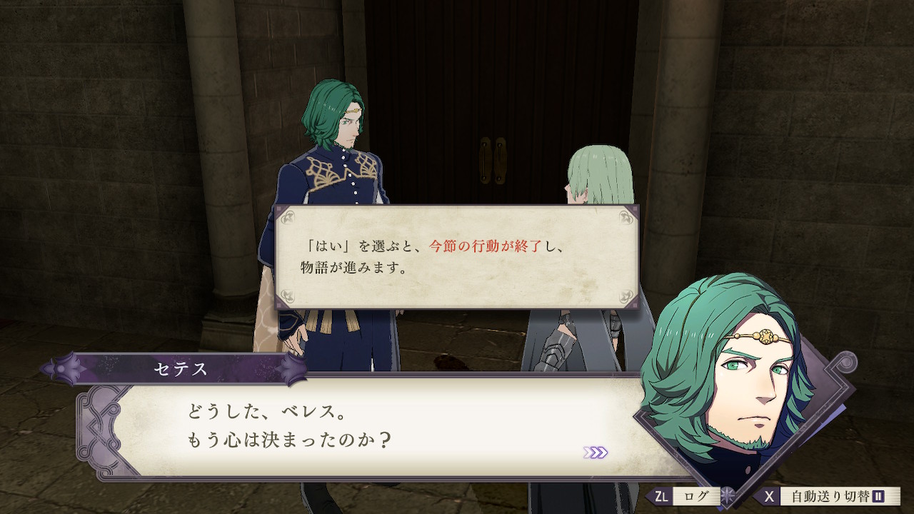 セテスに話しかけると考えがまとまったかどうかの選択肢が表示され、はいを選ぶとその月の活動が強制終了する