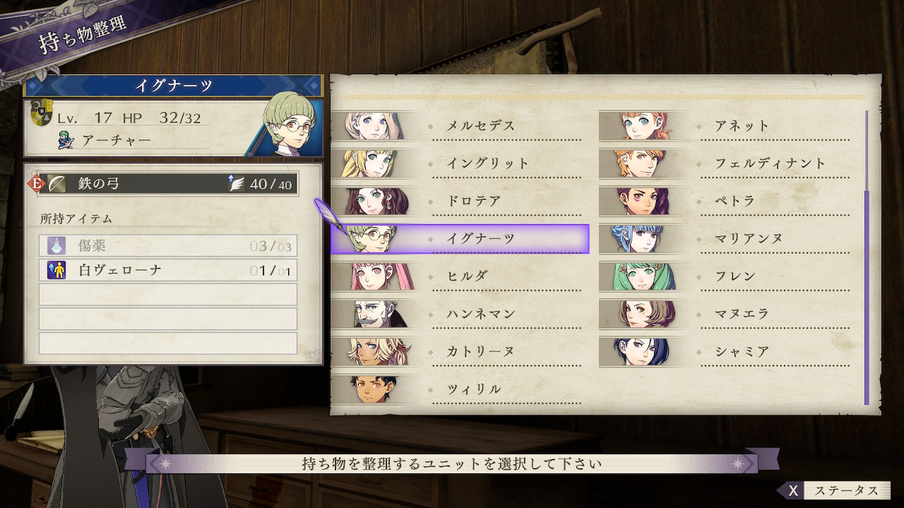 今回は青獅子ルートなので青獅子の生徒は全員主力で使うとして、他学級は金鹿のマリアンヌ、ヒルダ、イグナーツ、あとはフレンを主力にする