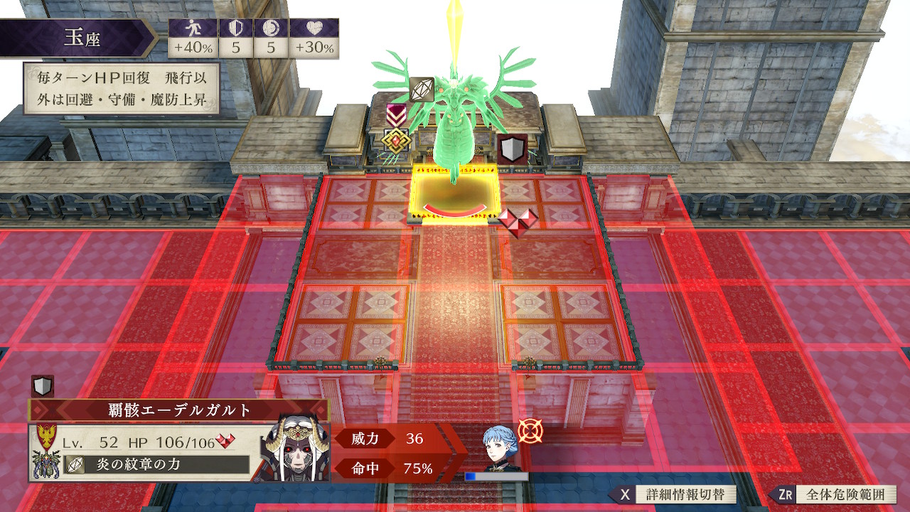 玉座の間の敵の数が減ってきたら、ラスボスの超射程の攻撃を止めるためユニットを単騎で突入させるが、部屋内で待機した後レスキューで救出するとイベントは発生せず、部屋内でプレイヤーフェイズを終了させなければならない