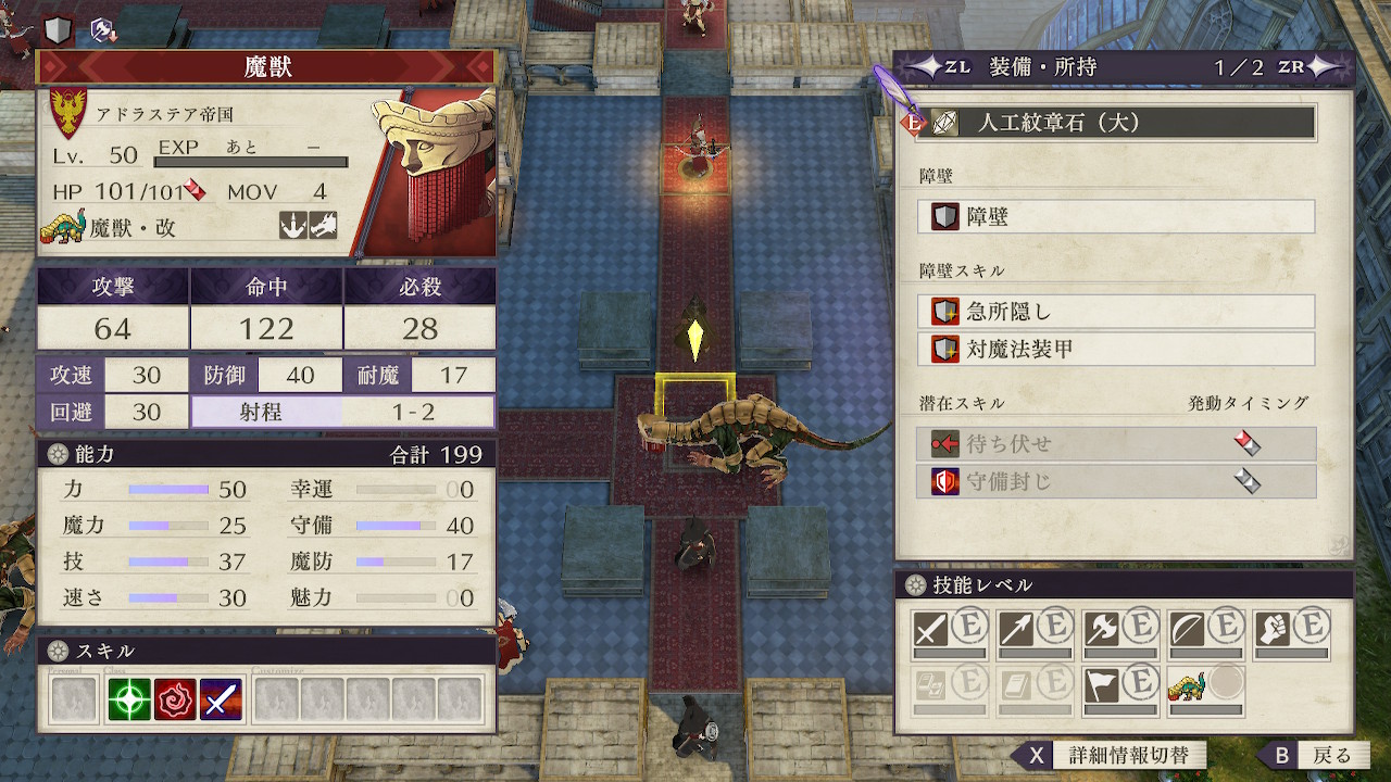 HPも非常に高いため魔法で必殺が出るのを期待せざるを得ないが、攻撃力も魔法系を余裕で即死させるほど高く、待ち伏せのスキルまで持っているため、魔法で攻める場合は必ず3マス以上の射程で攻撃すること