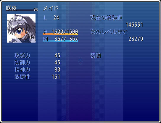 んで咲夜のステータスを見ると、初期LVは24でかなり高いんだけど、解説の通り敏捷性以外残念なことに