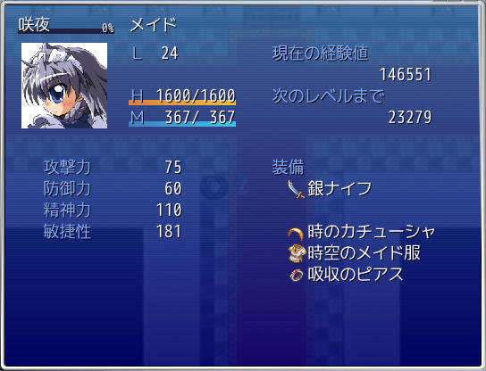 っていうか攻撃力や防御力がパチュリーよりも低いのって残念すぎるだろ、メイド長としてorz