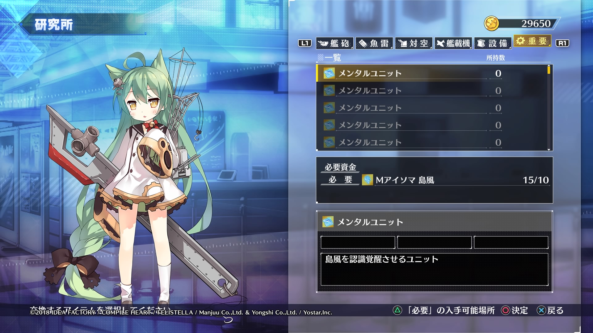 メンタルユニットとの交換に必要なMアイソマの個数は主力艦は10個、支援艦は5個