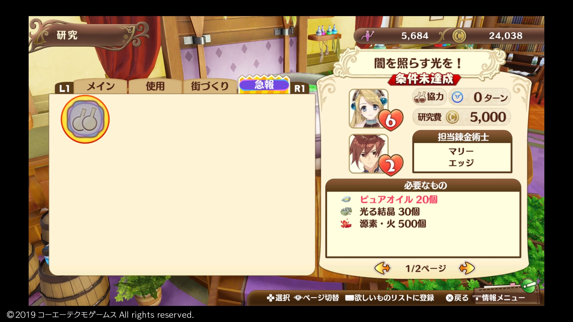 建築のための資材や研究のために揃えた道具と、それを調合するために必要な材料はショップで売却するわけにはいかないので、ショップに並べられる道具が制限されてしまう