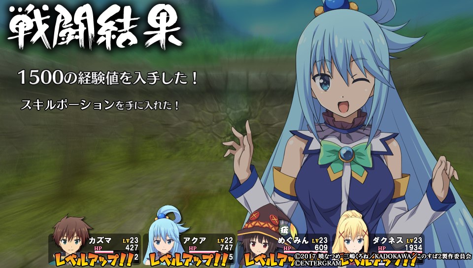 めぐみんはご覧の有様だし、ダクネスは例によって攻撃が全く当たらないし、アクアは一応全体魔法攻撃使えるけど、かしこさが低い(笑)せいで大きなダメージは期待できない