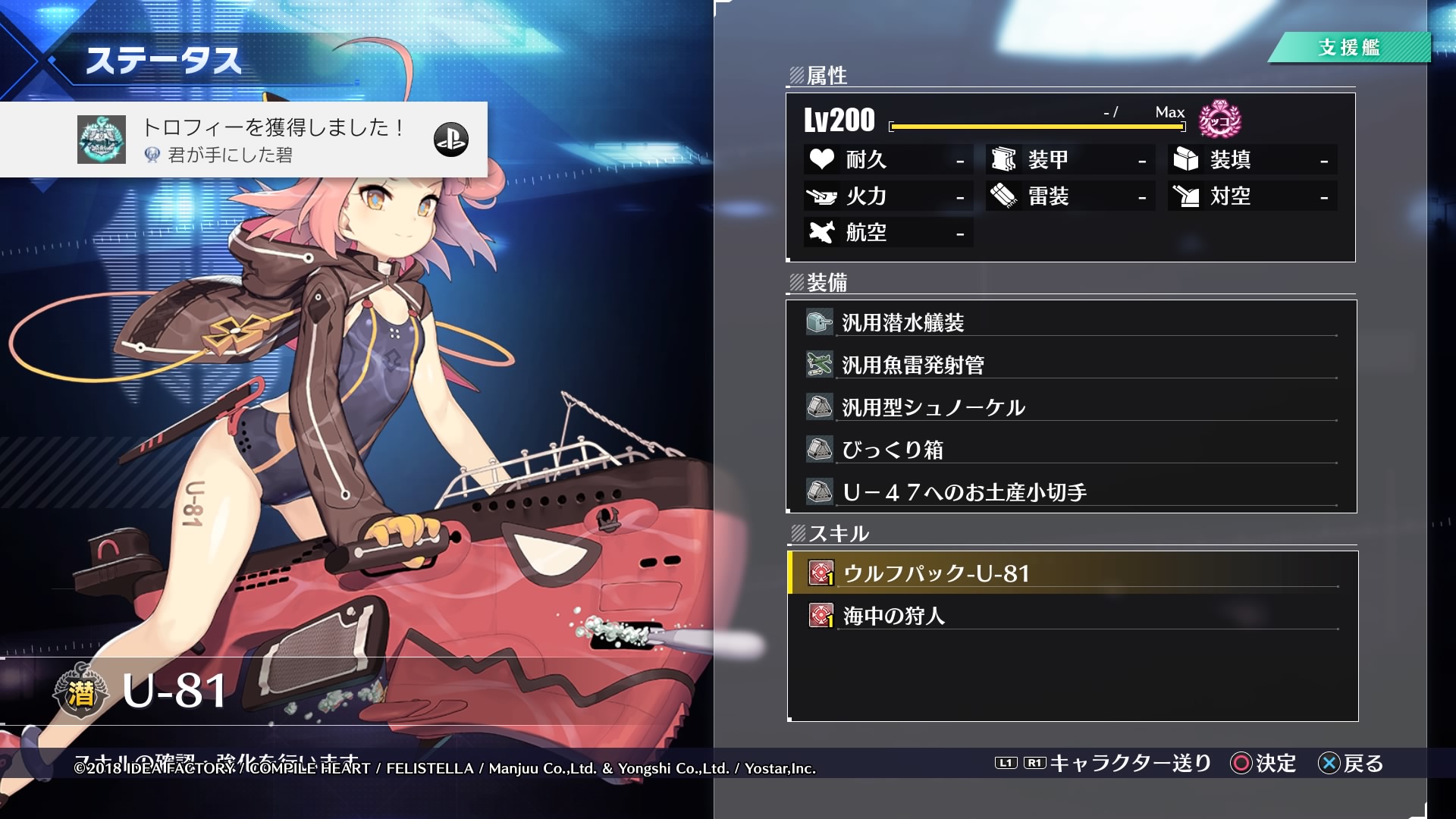 プラチナトロフィー獲得!デフォルトの順番でケッコンを進めたので、最後のケッコン相手はU-81でした 艦船を秘書艦にして10回バトルするのを繰り返して全艦とケッコンを果たしたことで、ギャラリーモードのコンプリートで楽園の蒐集者を獲得