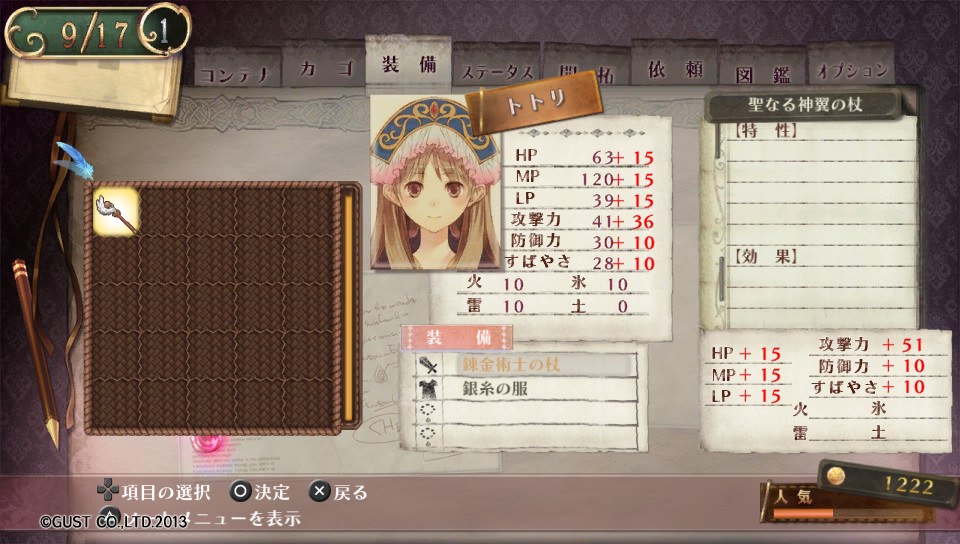 で、トトリが最初から超強いというのはわかってたんですが、今回はさらにトトリのアトリエPlusのセーブデータ連動で得られた武器があるのでそれを装備させたところ、全能力が大幅に強化されるという最強装備でした!