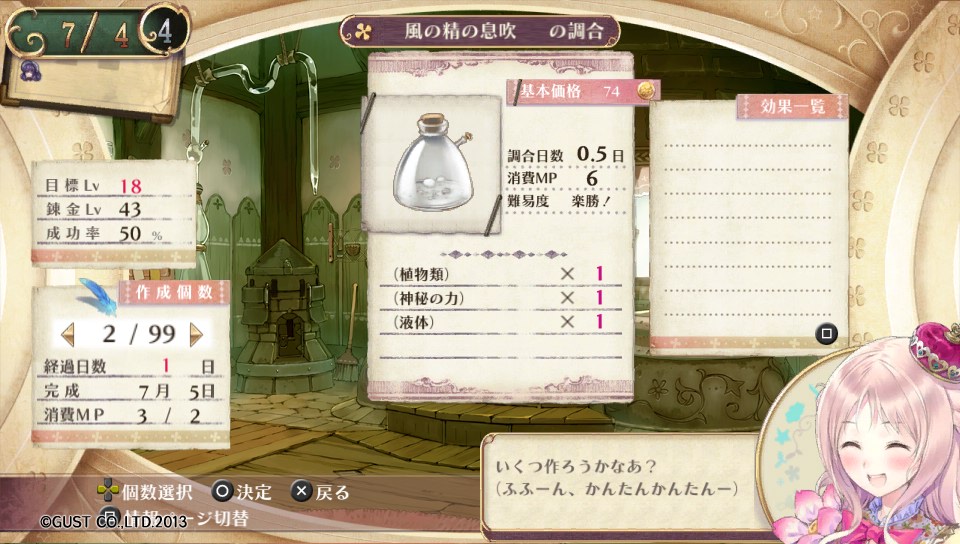 調合の正否に関わらず、MPが0になるとメルルが倒れて強制的に1日休まされてMPが回復してしまうので、MPを0にする前にはセーブをしておき、失敗するまで試行しなければなりません