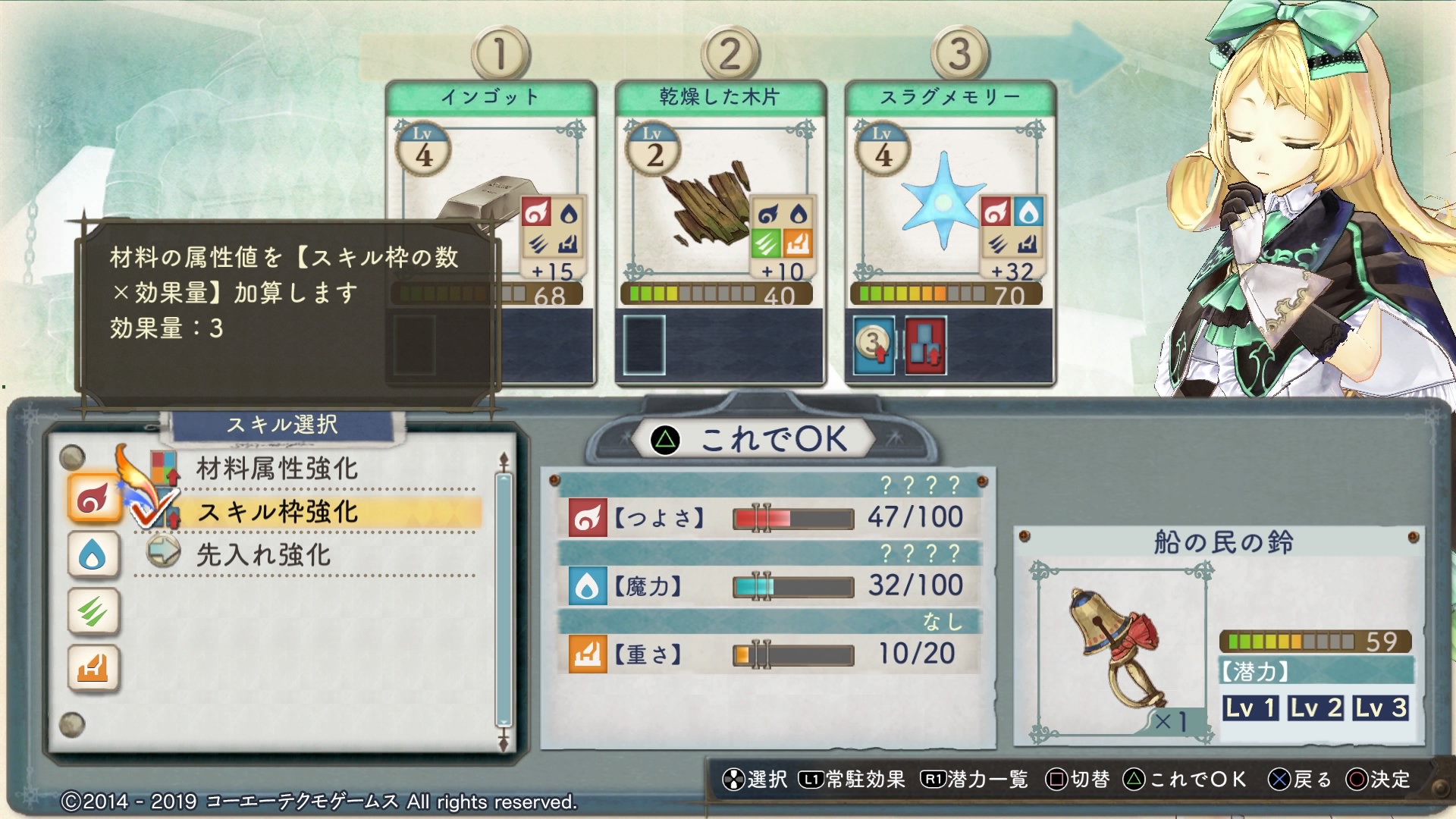 画面のレイアウトや錬成の手順は調合と一緒で、ここではミルカがそれをやってくれます