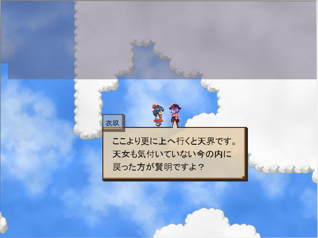 再度話しかけると仲間にできそうな選択肢が出てきた。う~ん衣玖さんは仲間にしたいけど、レベル上げ中の今1から育てるのもきついので仲間にはしない。話すとここから東に行けば妖怪の山に行けるそうだ。